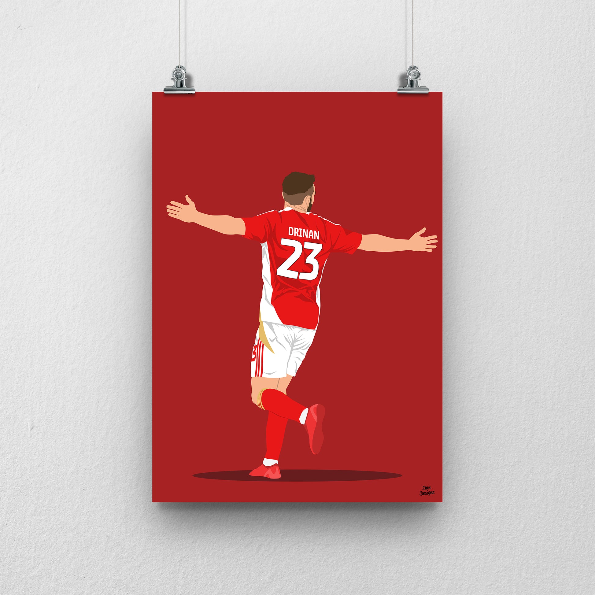 This print features my illustrated design of Aaron Drinan in Swindon Town colours, created as part of my official partnership with the club. Known for goal, goals and more goals. Drinan has become a popular figure at the County Ground.