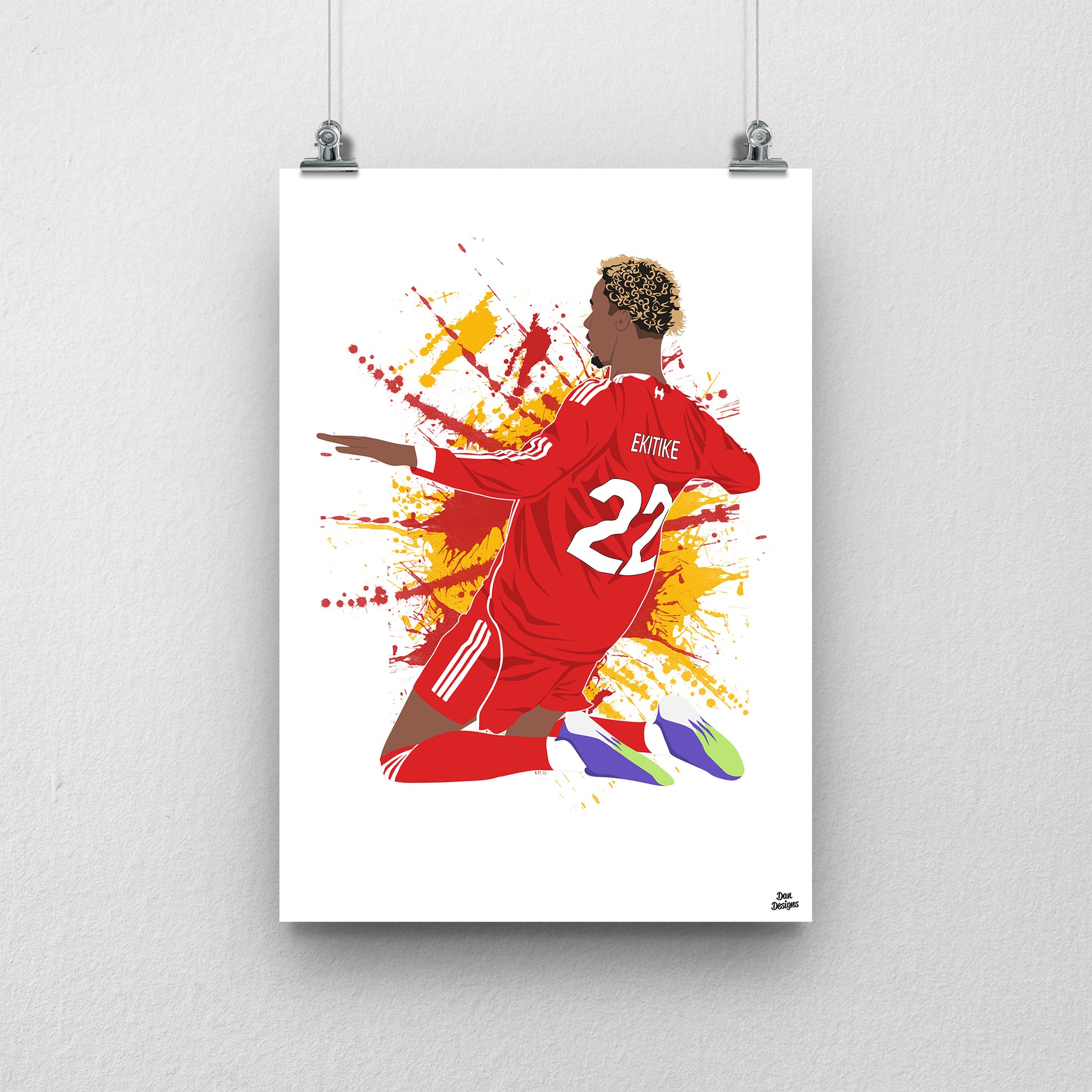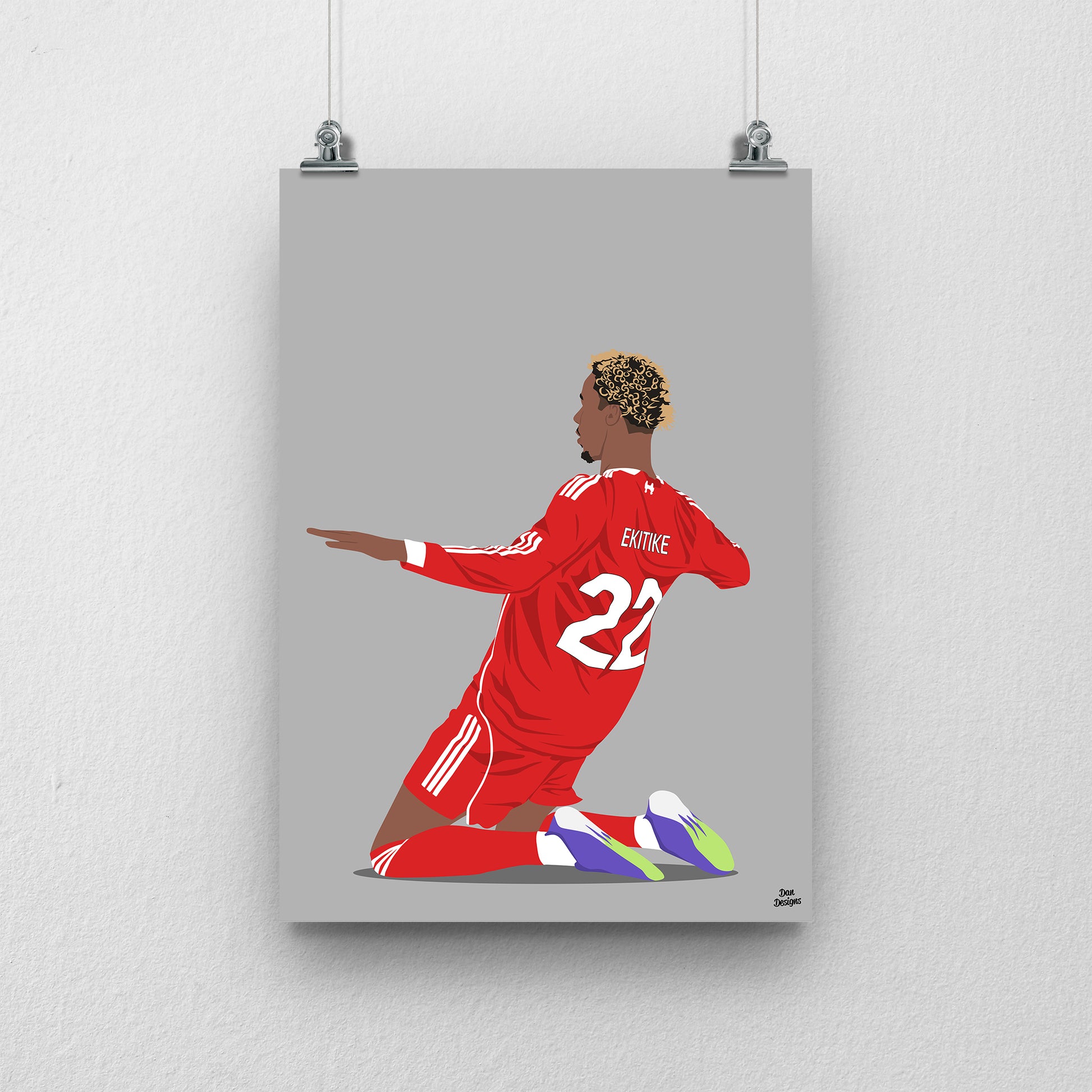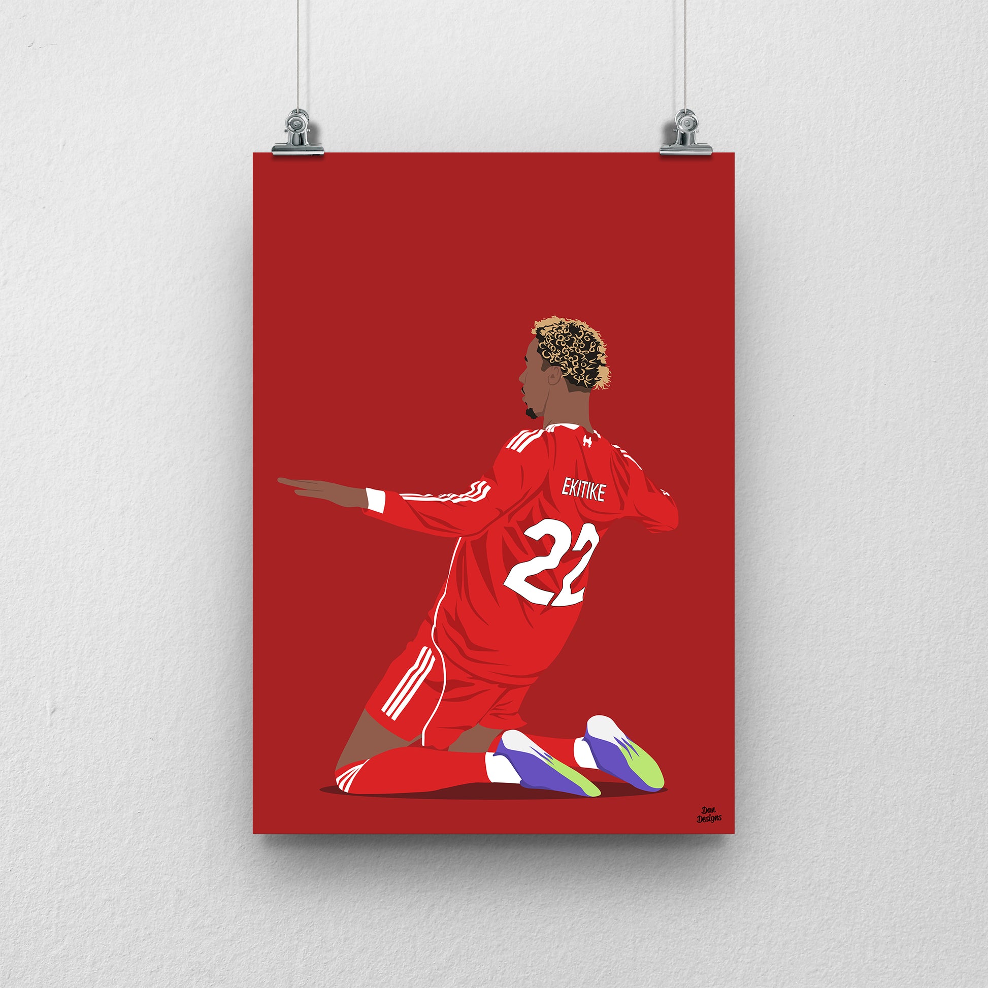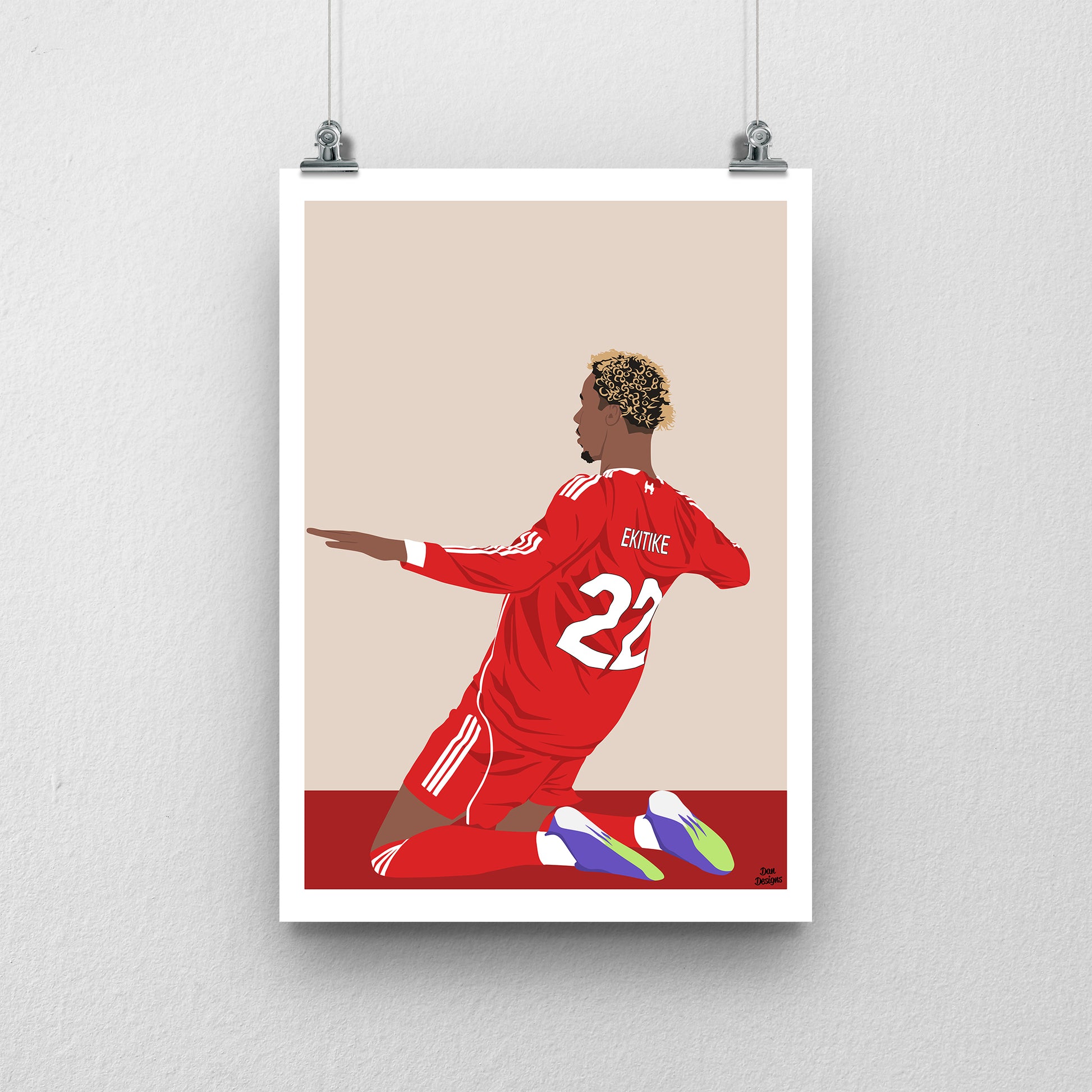 This print features my original artwork of Hugo Ekitike in a Liverpool shirt.