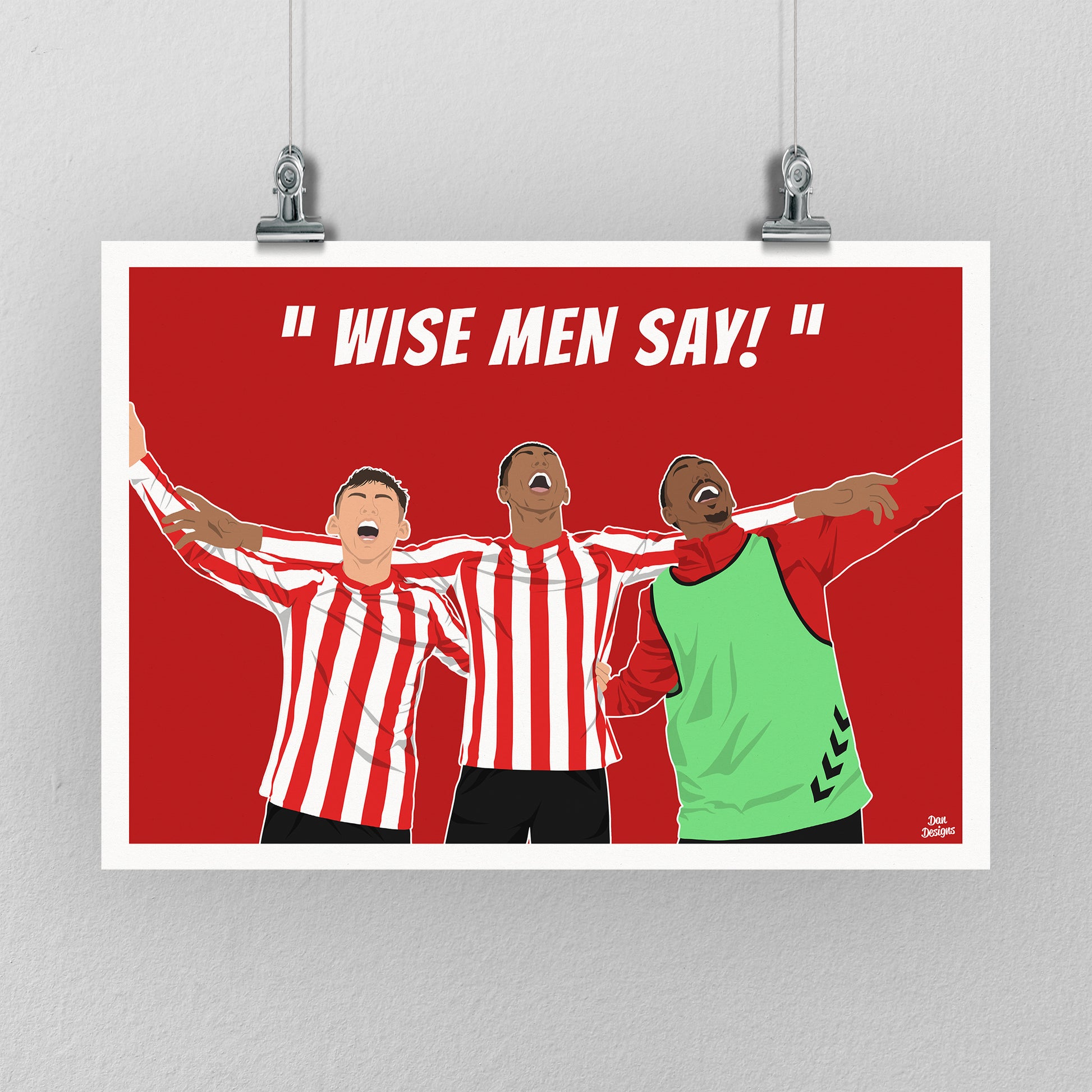 The play-off semi-final at the Stadium of Light, a night you'll remember forever. Designed in partnership with Sunderland — Jobe Bellingham, Chris Rigg, Wilson Isidor singing Wise Men Say.