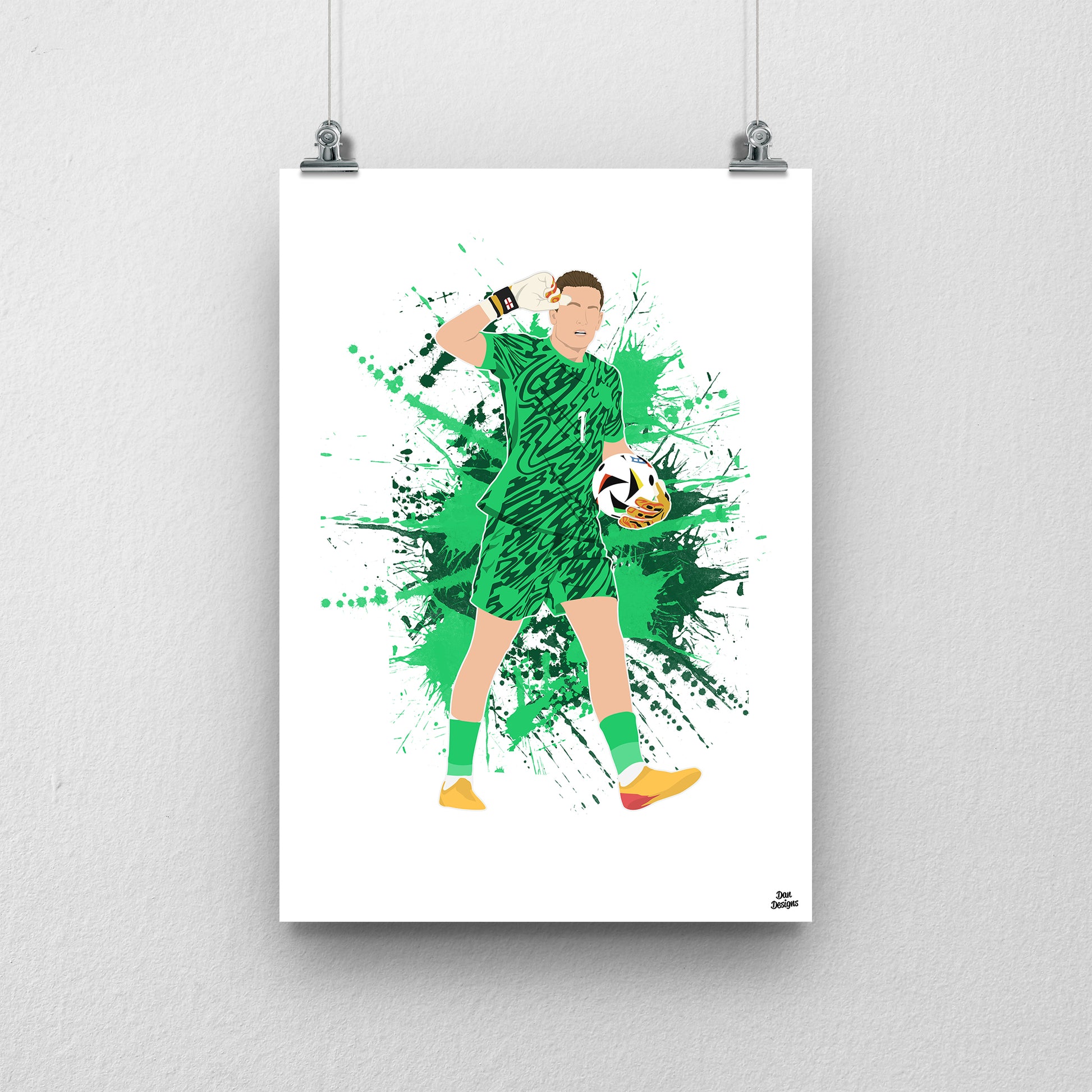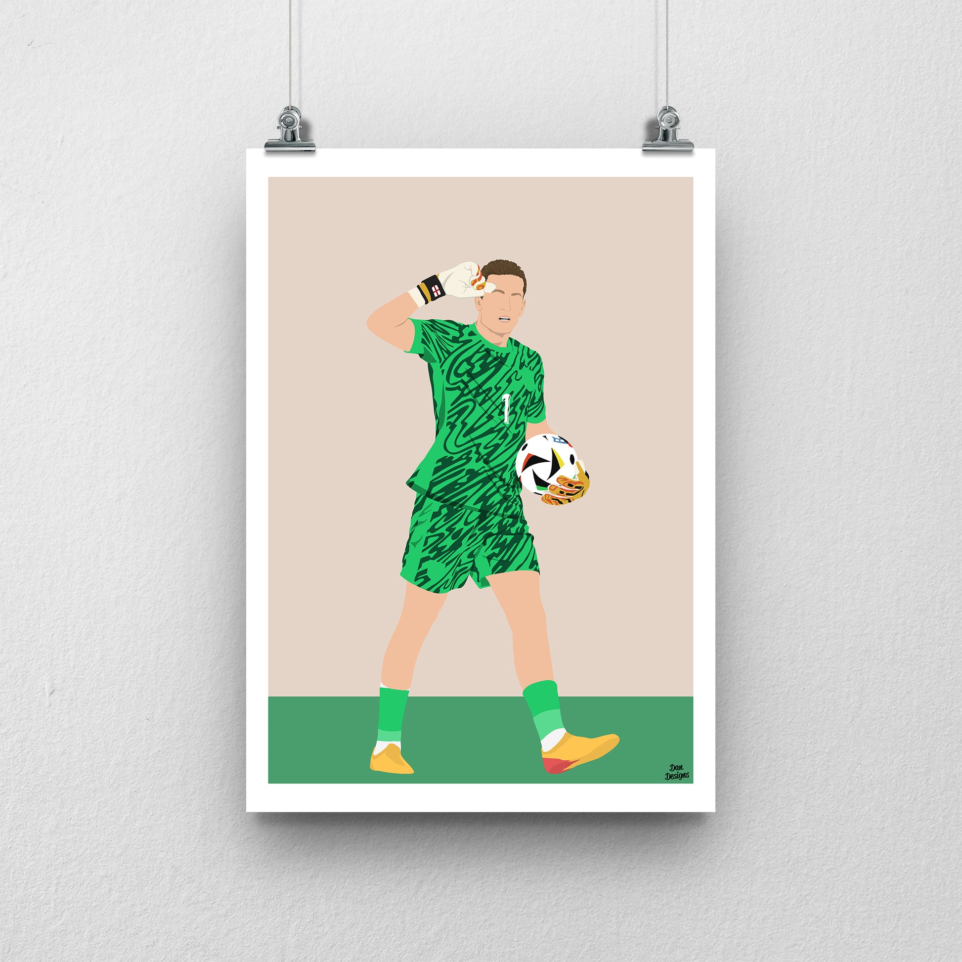 Commanding, vocal and clutch in the big moments — Jordan Pickford has been at the heart of England’s modern era. This print captures that sharp concentration and leadership that supporters have come to rely on.