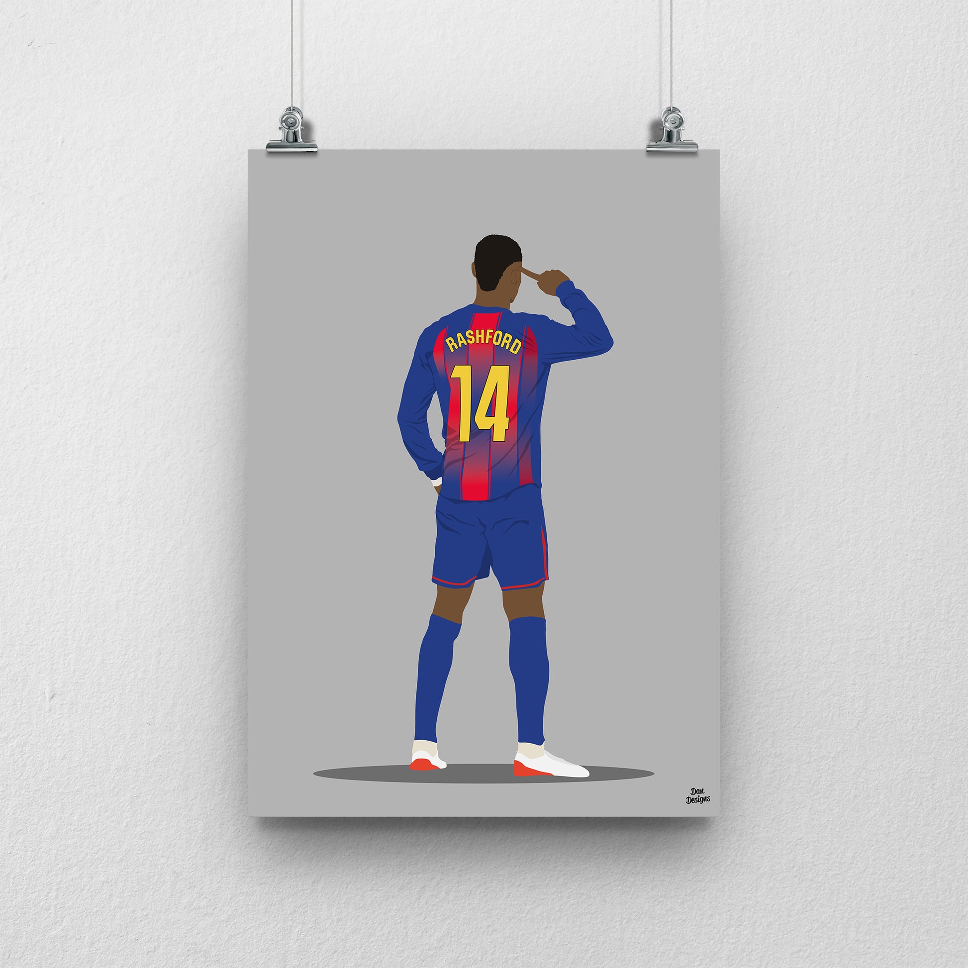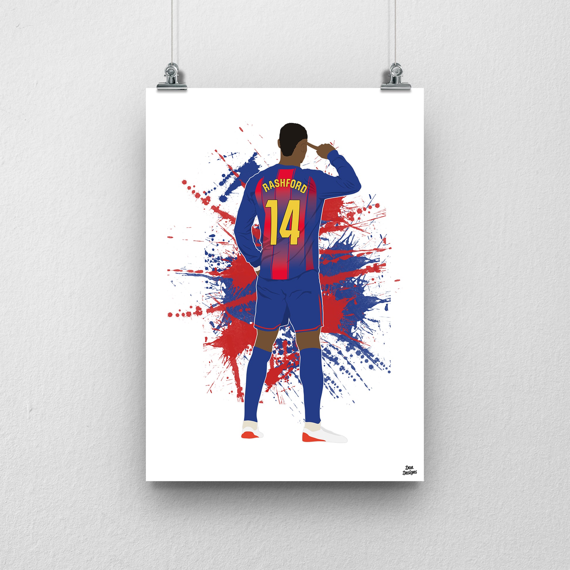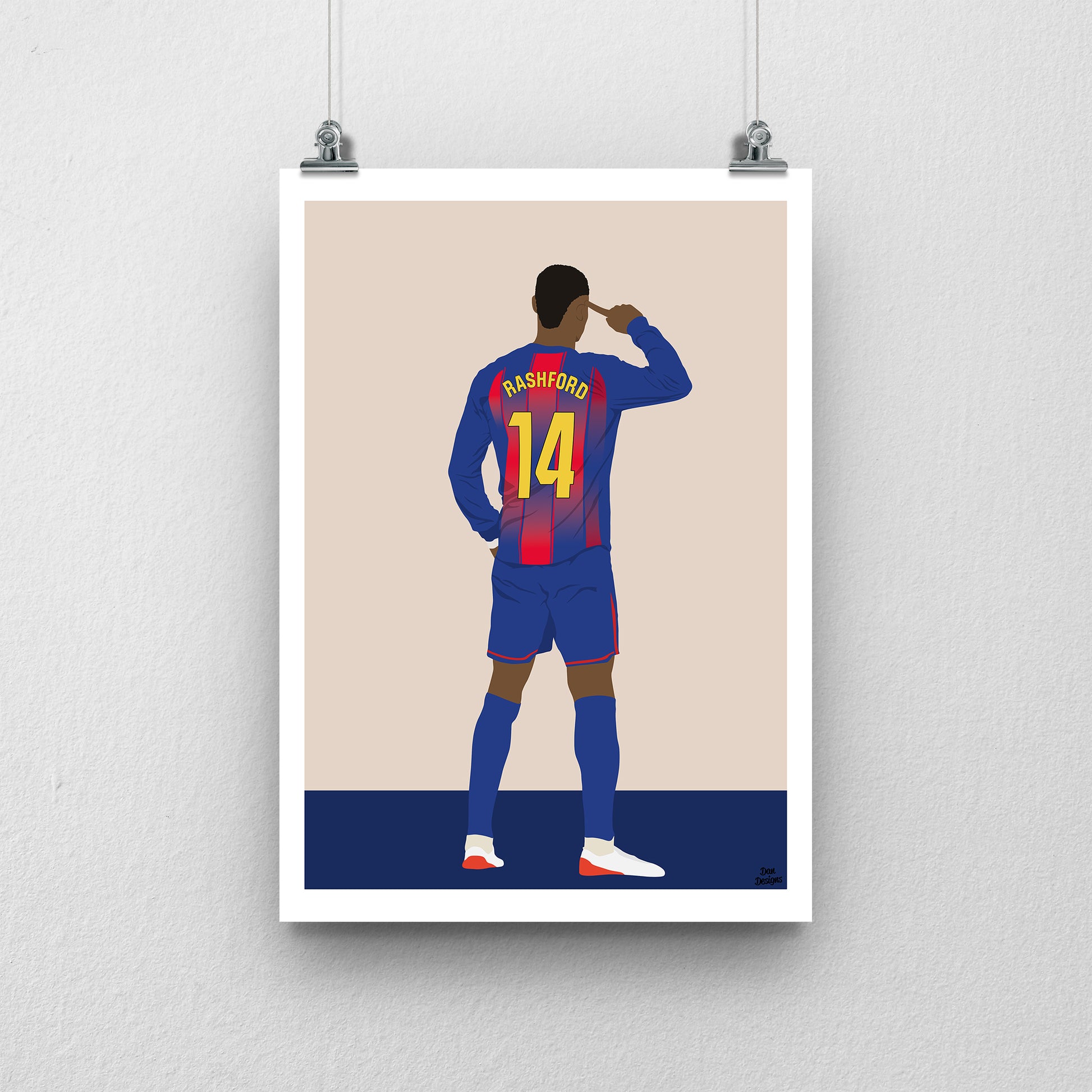 A bold new chapter for Marcus Rashford — this artwork captures the England forward now donning the colours of Barcelona. Known for his explosive pace, sharp finishing and intelligence in the final third, Rashford brings a new threat to La Liga in this striking print.