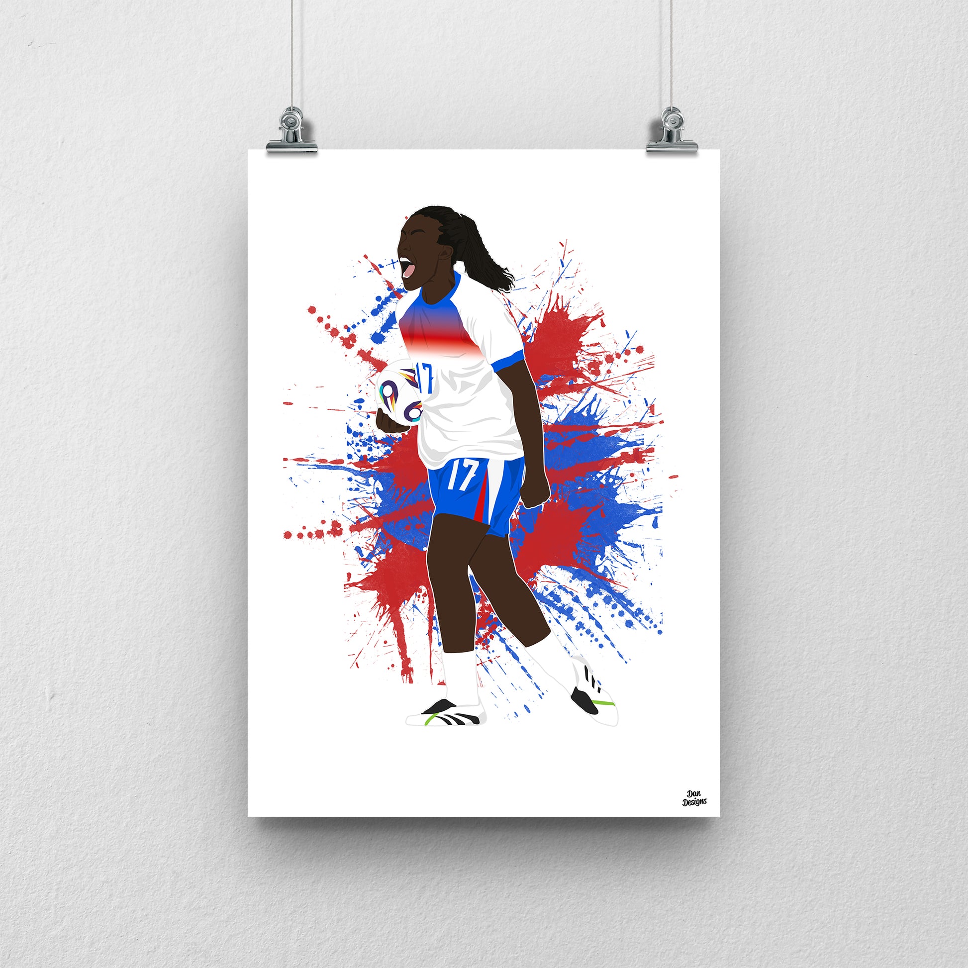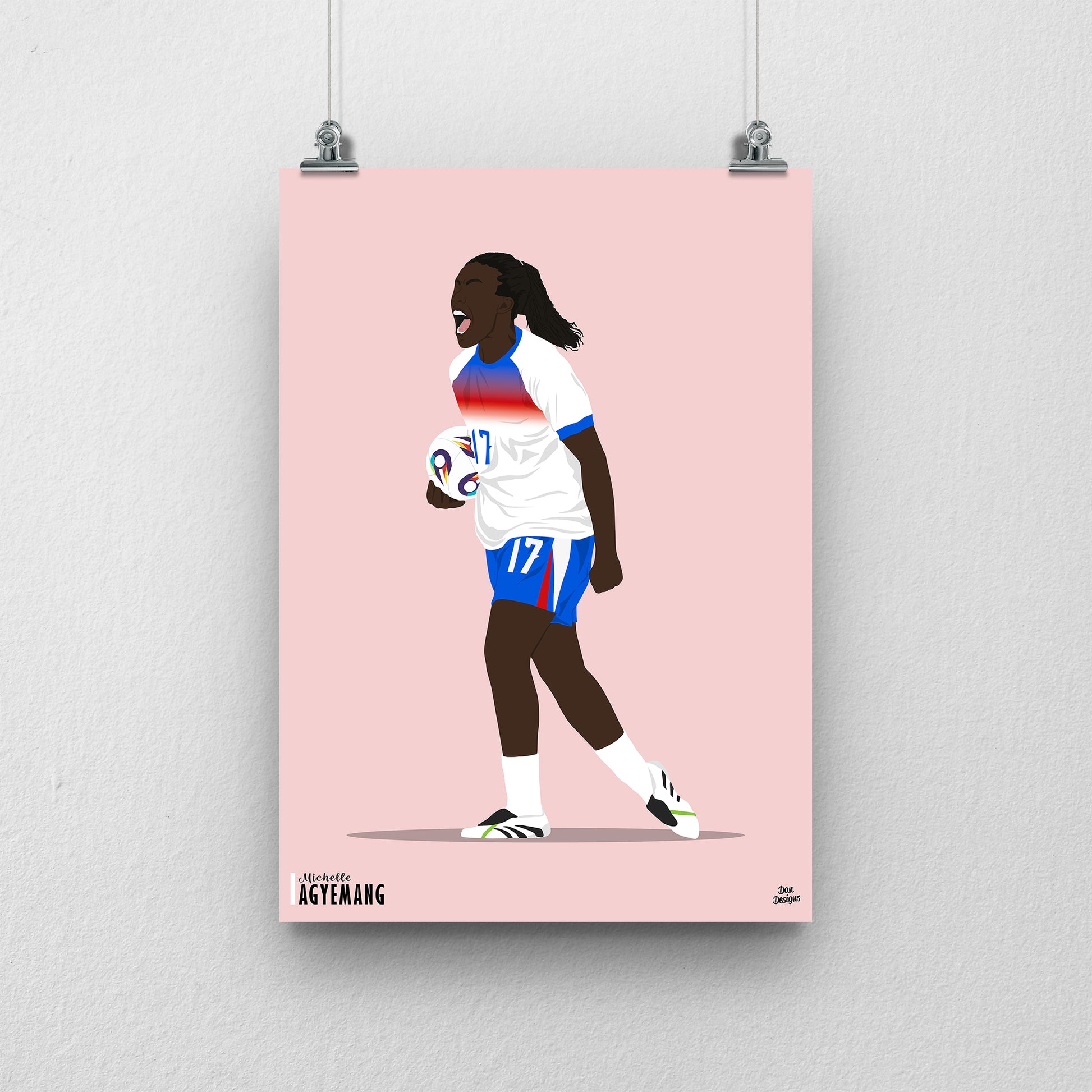 Celebrate Michelle Agyemang with this minimalist football art print, featuring one of England’s most exciting young forwards. A rising talent for Arsenal and England, Agyemang has impressed with her pace, strength, and maturity well beyond her years.